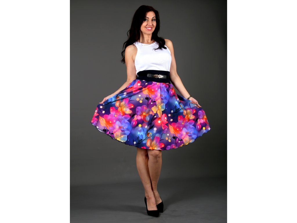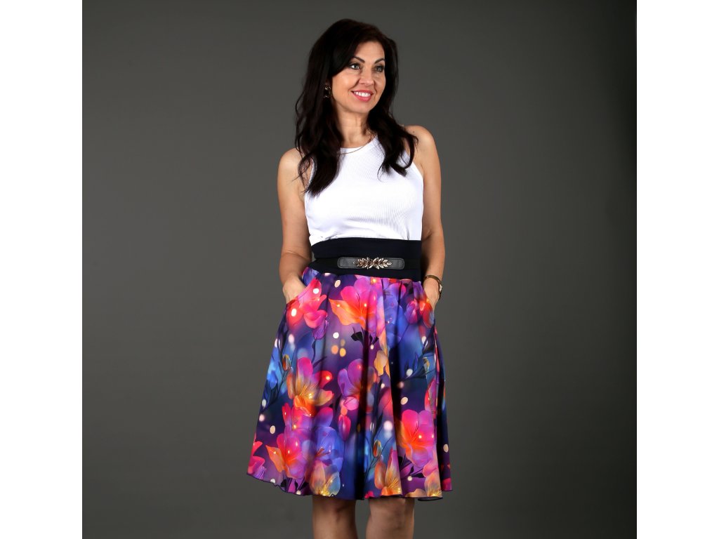 Když květiny světélkují… Tahle půlkolová sukně s pružným pasem a kapsou na všechny vaše malé poklady je jako z jiného světa. Záplava květin s jemnými odlesky připomíná světlušky tančící v podvečerním lese – nebo snad rostliny z Avataru? Růžovo-fialové tóny vnášejí do každého dne kapku snění. Střih lichotí většině ženských křivek bez ohledu na věk a styl. Sukni můžete doplnit páskem nebo sladit s horním dílem v jedné z tónů, které na sukni najdete. Je ideální pro romantické duše, ale rozhodně nejen pro ně. Protože v téhle sukni může zazářit úplně každá.