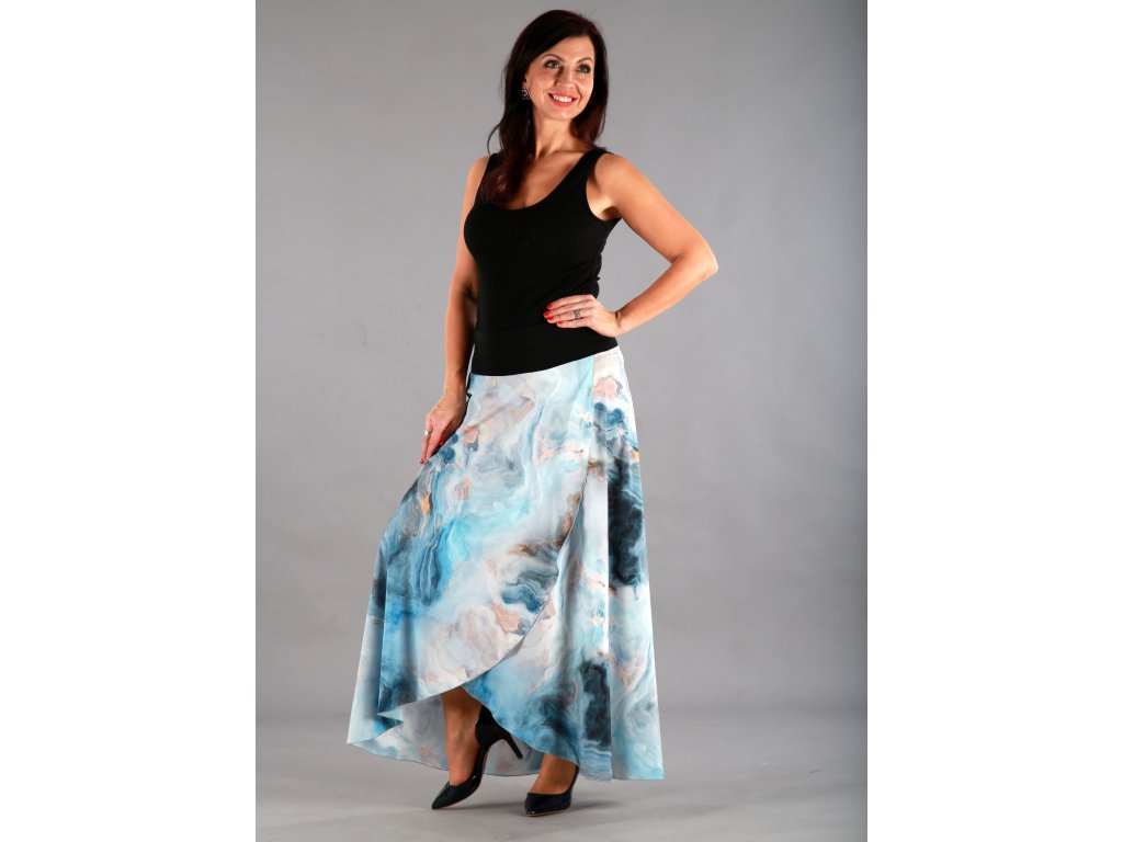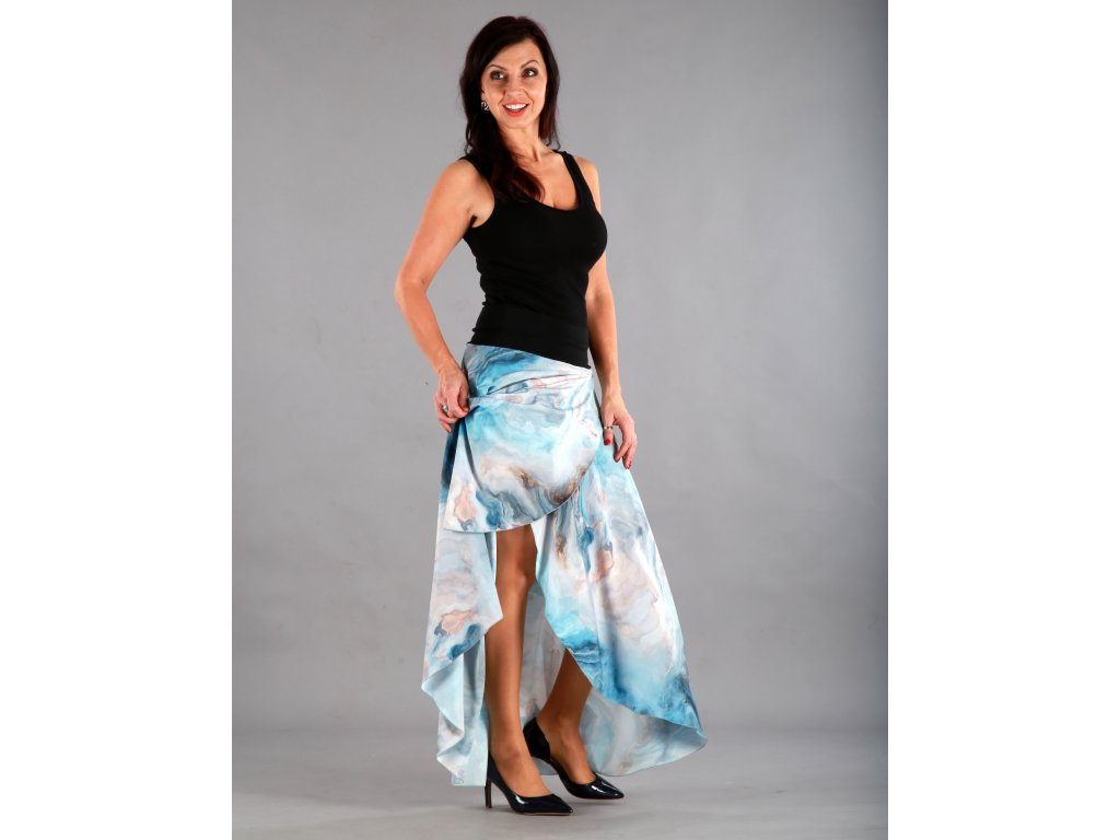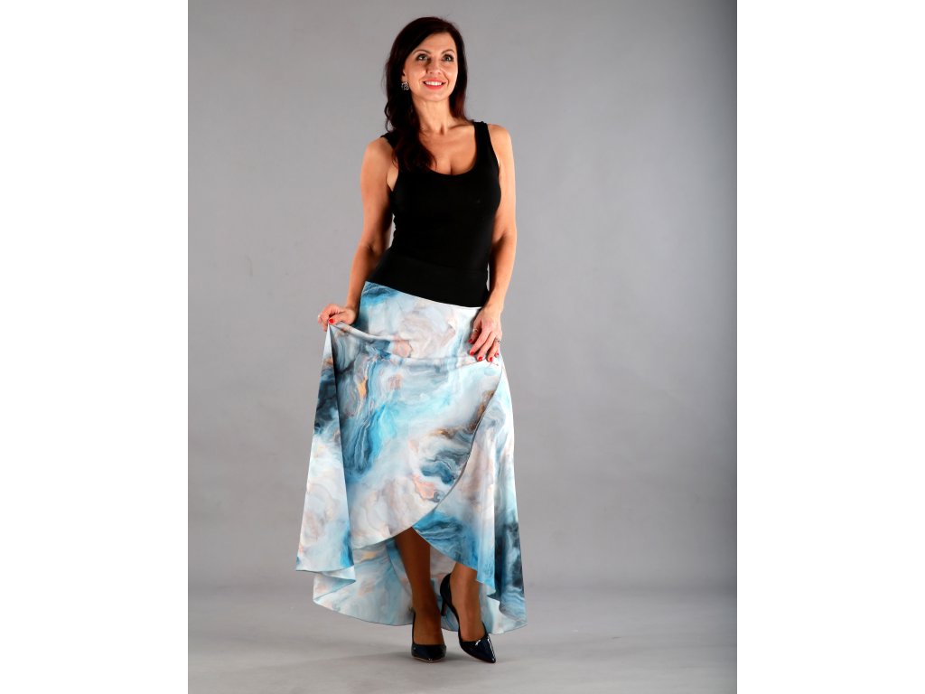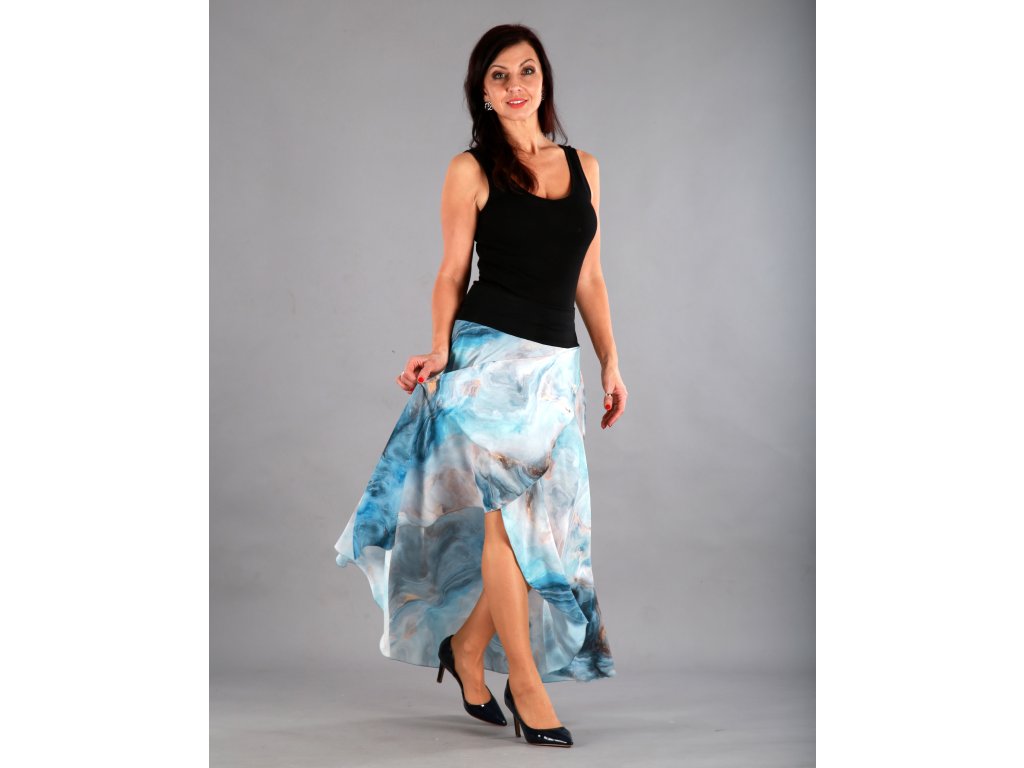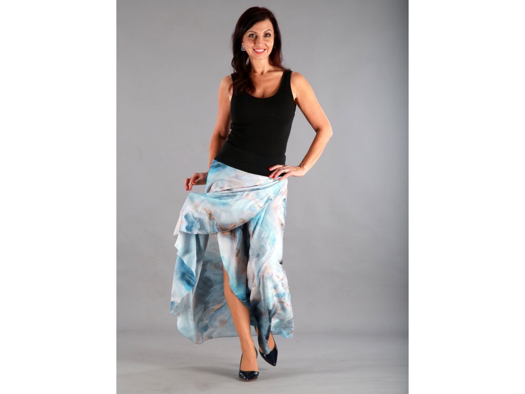 Dlouhá překřížená sukně má překrásný tmavěmodrý podklad, který připomíná bouři, nebo rozbouřené moře. Lekhé jako pírko, vzdušné jako vánek a je neskutečně příjemné na dotek.