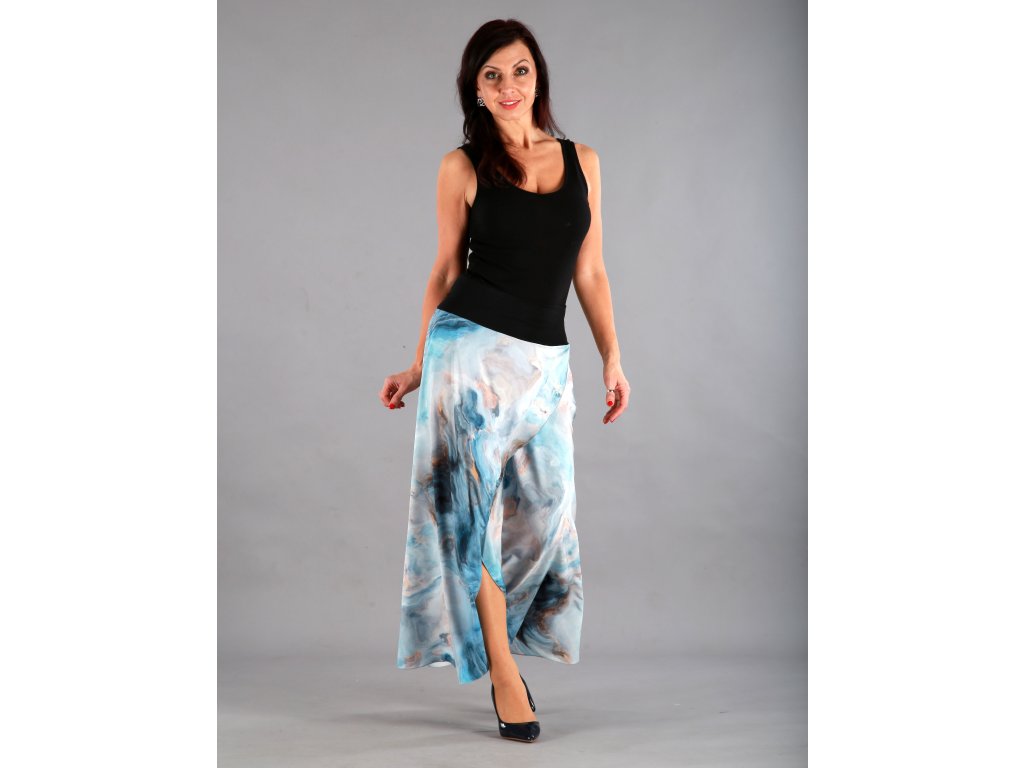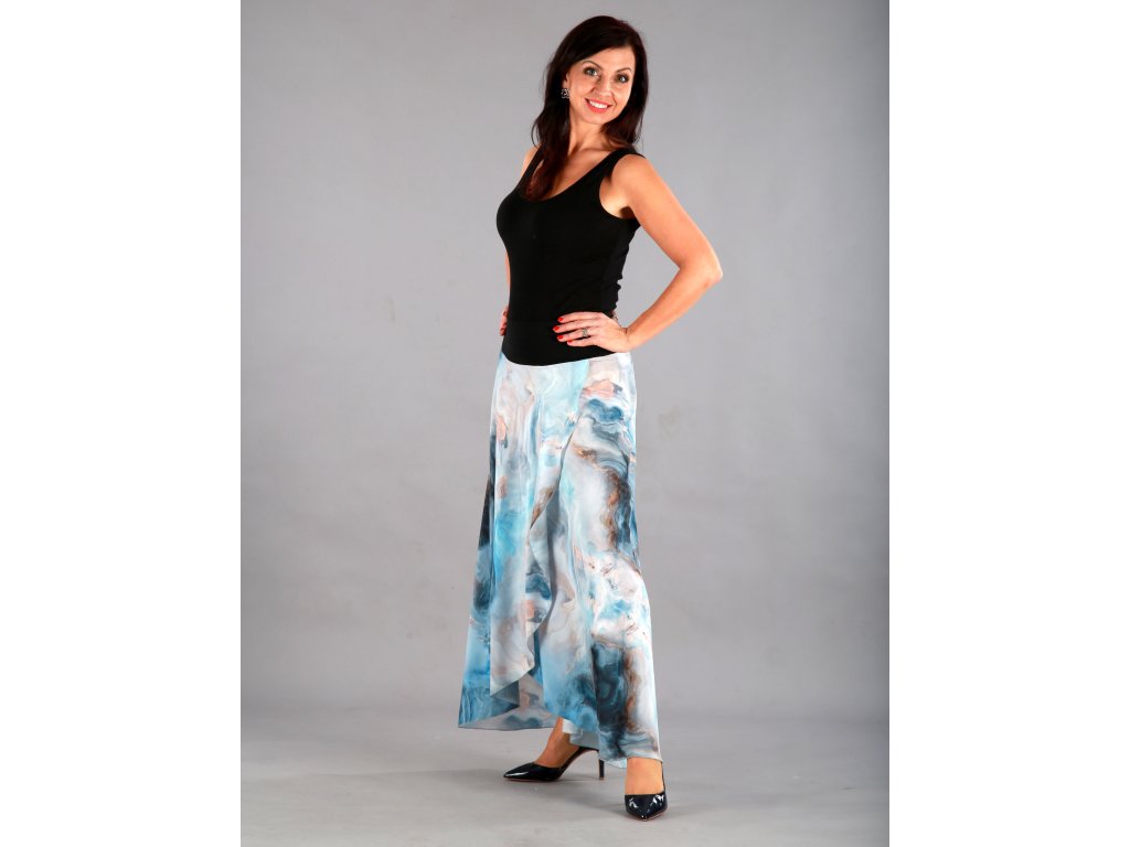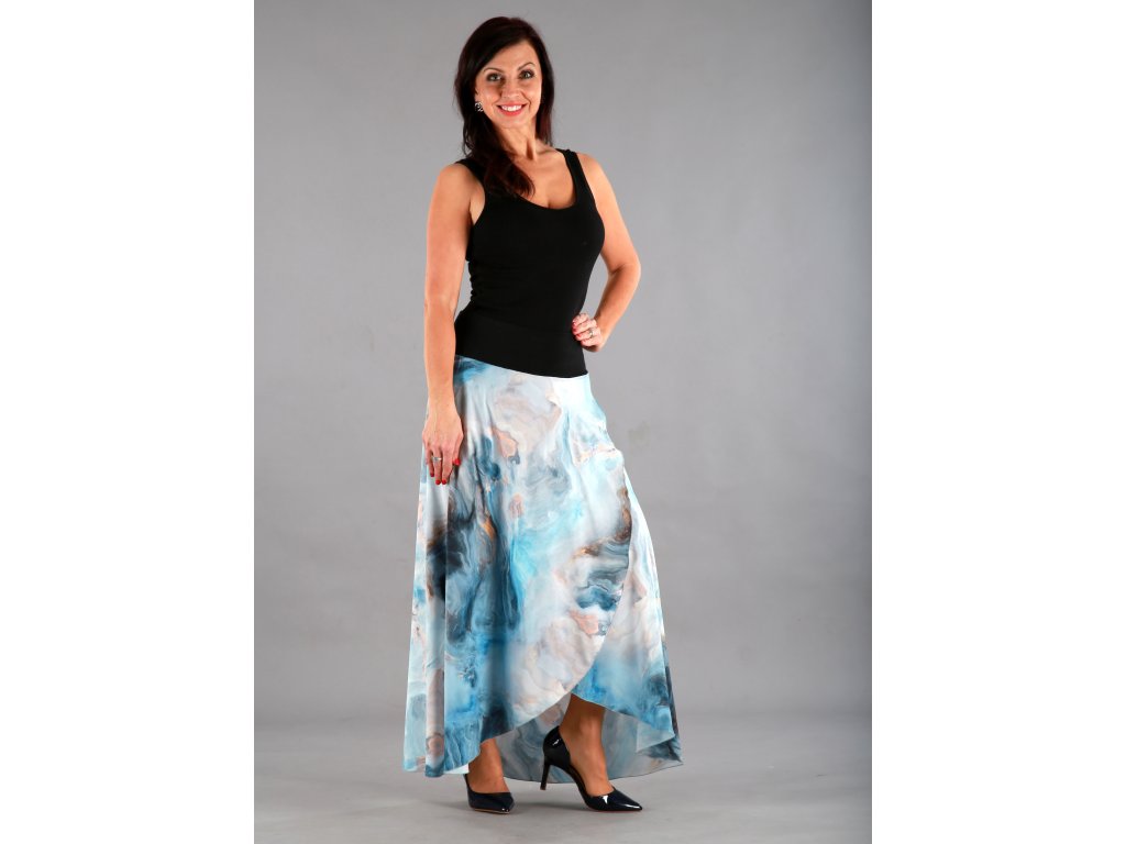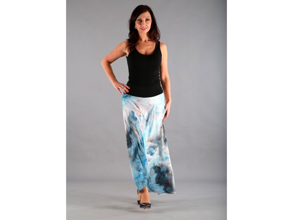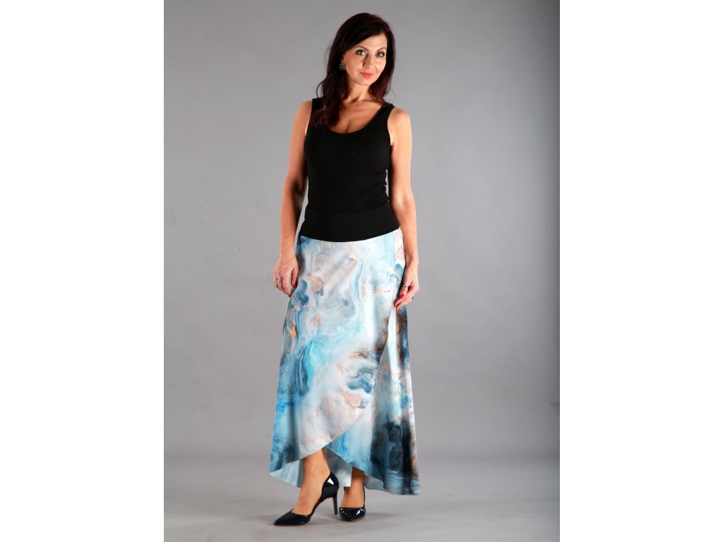 Dlouhá překřížená sukně má překrásný tmavěmodrý podklad, který připomíná bouři, nebo rozbouřené moře. Lekhé jako pírko, vzdušné jako vánek a je neskutečně příjemné na dotek.