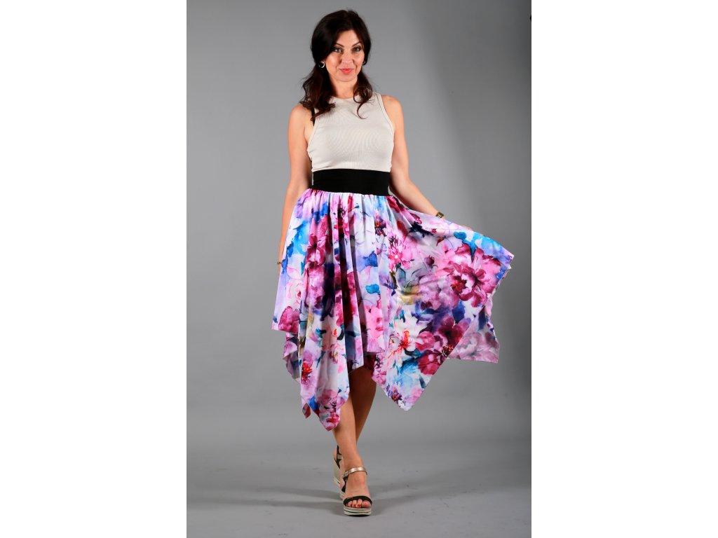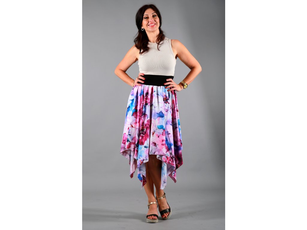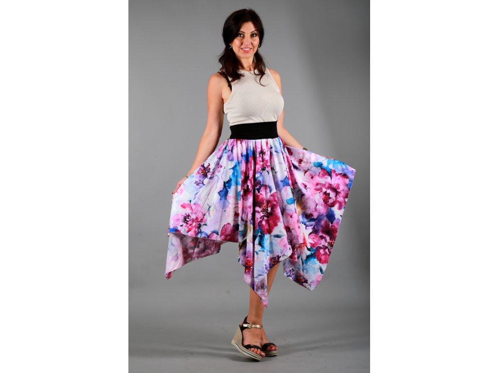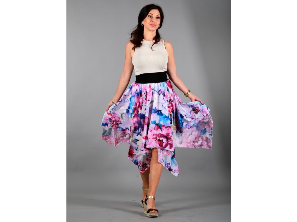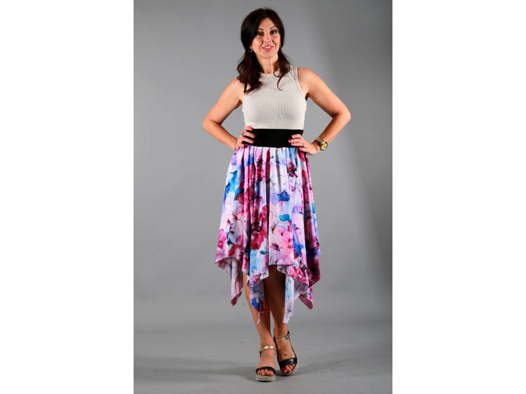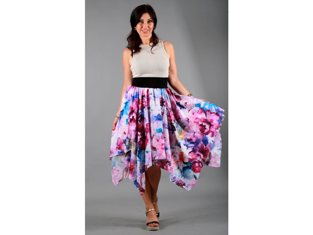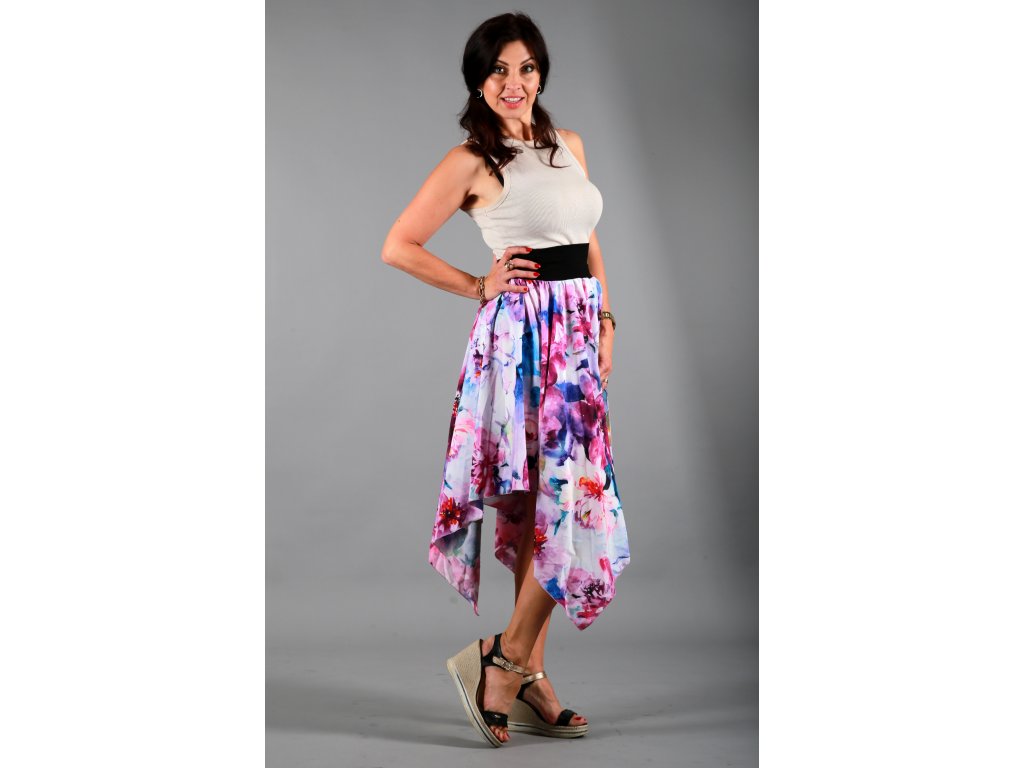 Elegantní cípatá Rozkvetlá sukně nese na sobě voňavé výrazné květy, která provoní Váš den i mysl.