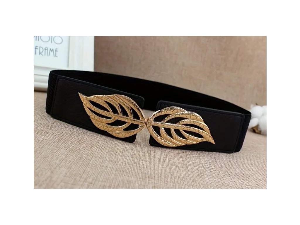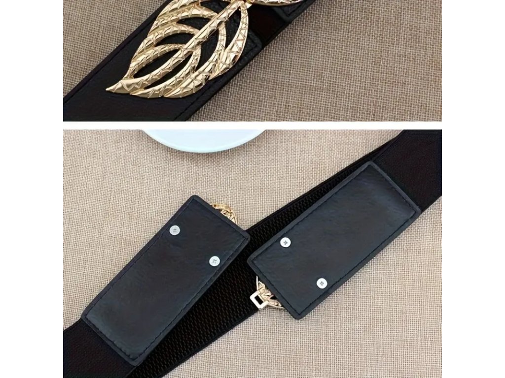 Elegantní dámský pásek se zlatavými listy a mašlí - nastavitelný elastický pas se zlatavou přezkou ve tvaru listu