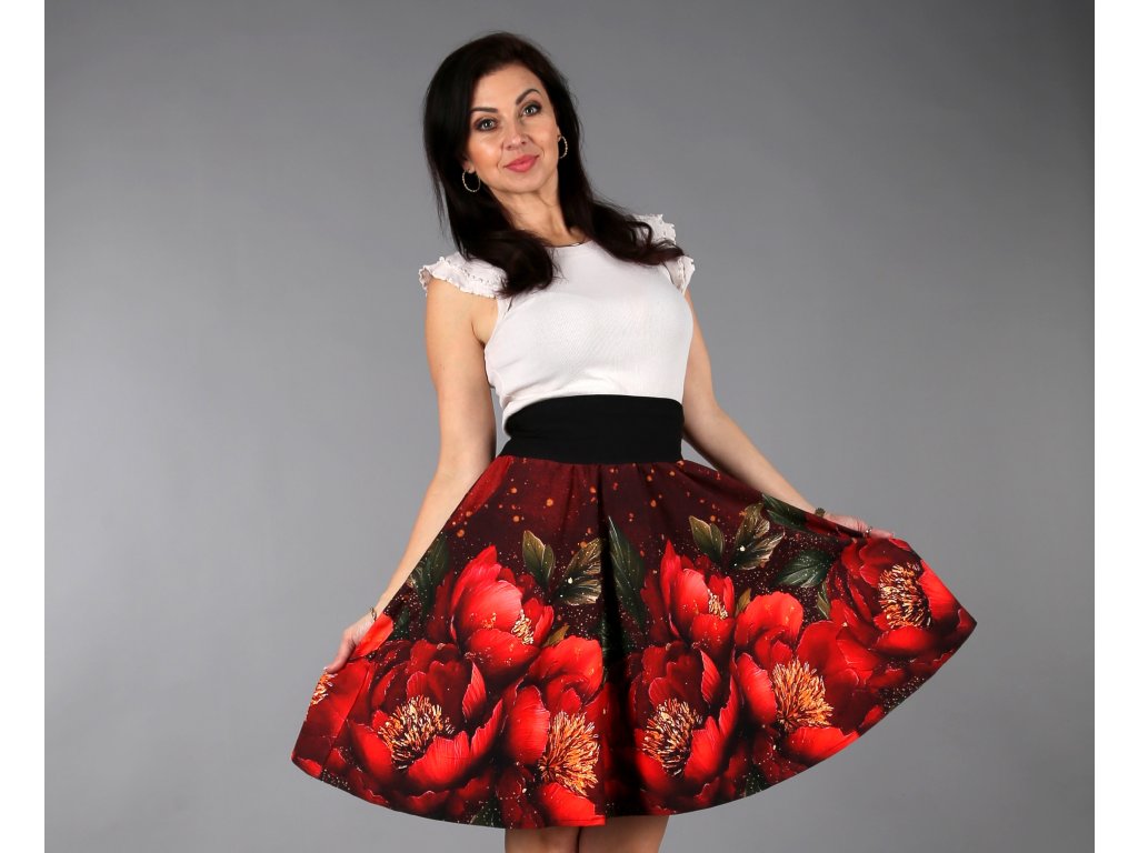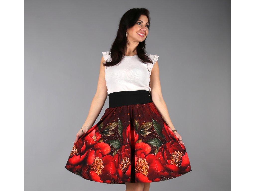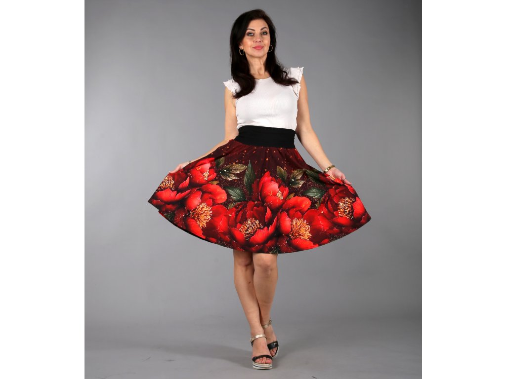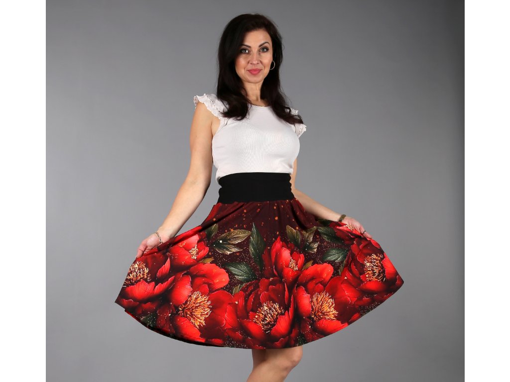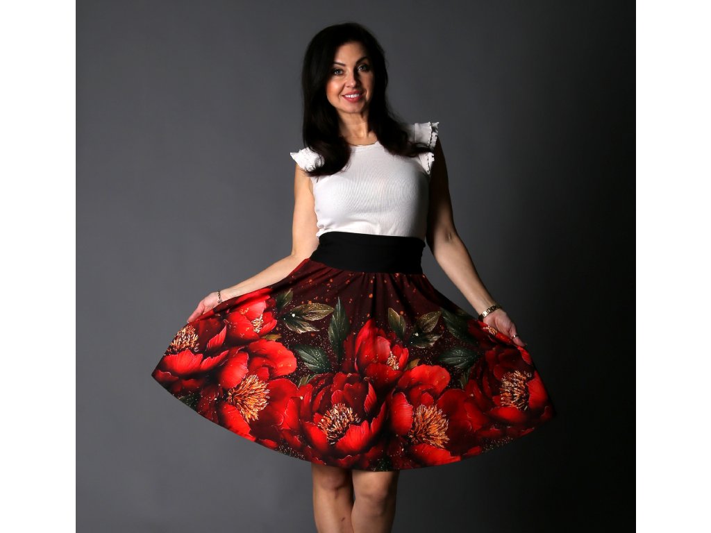 Překrásná půlkolová sukénka s vysokým pružným pasem a kapsy na poklady. Na sukni najdete voňavé, velké květy pivoněk, které rozzáří váš den, rozhoupe boky a budete se v ní cítit báječně.