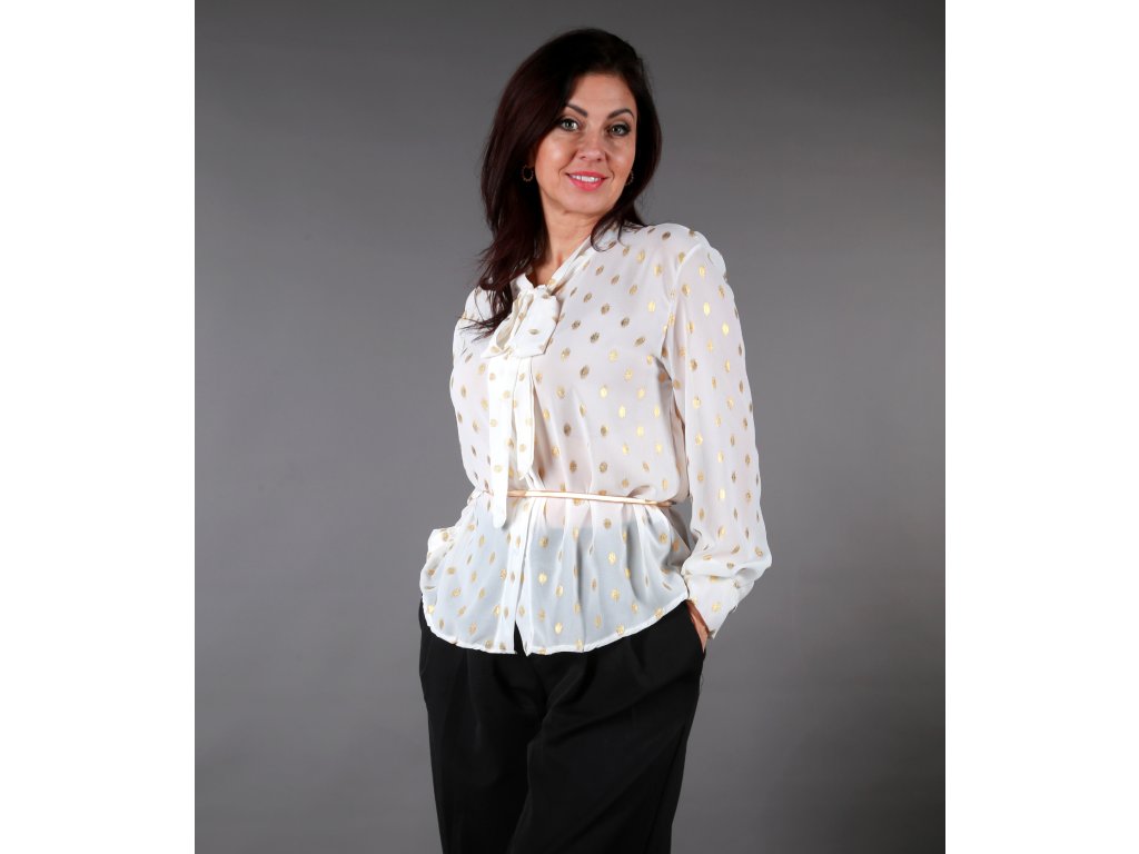 Lehoučká jako vánek, vzdušná a neuvěřitelně příjemná na nošení. Tato překrásná halenka je přesně ten kousek, který využijete po celý rok. Dominantním prvkem je zlatý vzor v podobě rozpitých teček, který působí jemně, luxusně a opravdu výjimečně. Na světle se krásně vzor leskne a dodává halence noblesní vzhled.