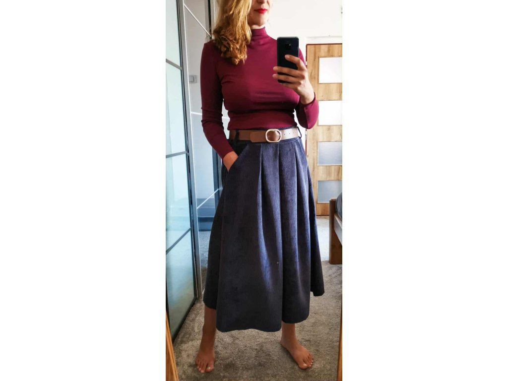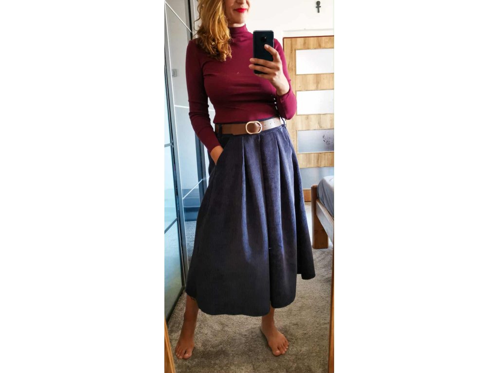 Délka sukně je ideální cca 84cm – na postavě s výškou 176 cm sahá tak akorát, aby působila žensky a zároveň pohodlně.