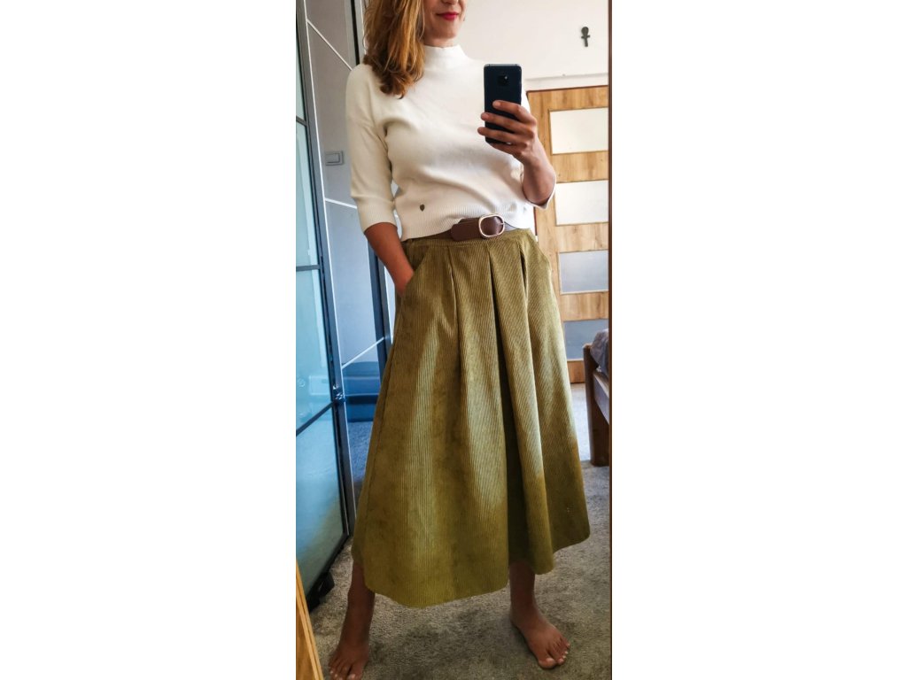 Délka sukně je ideální cca 84cm – na postavě s výškou 176 cm sahá tak akorát, aby působila žensky a zároveň pohodlně.