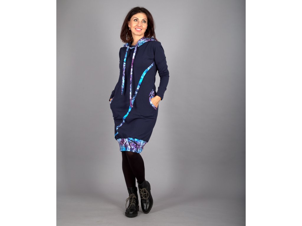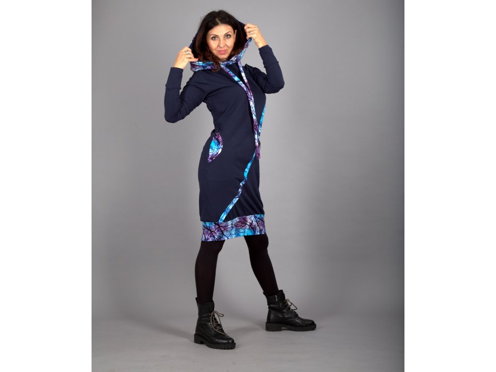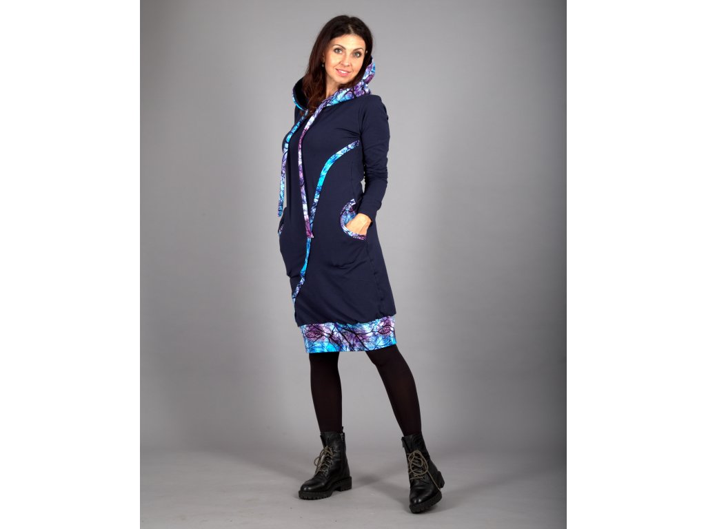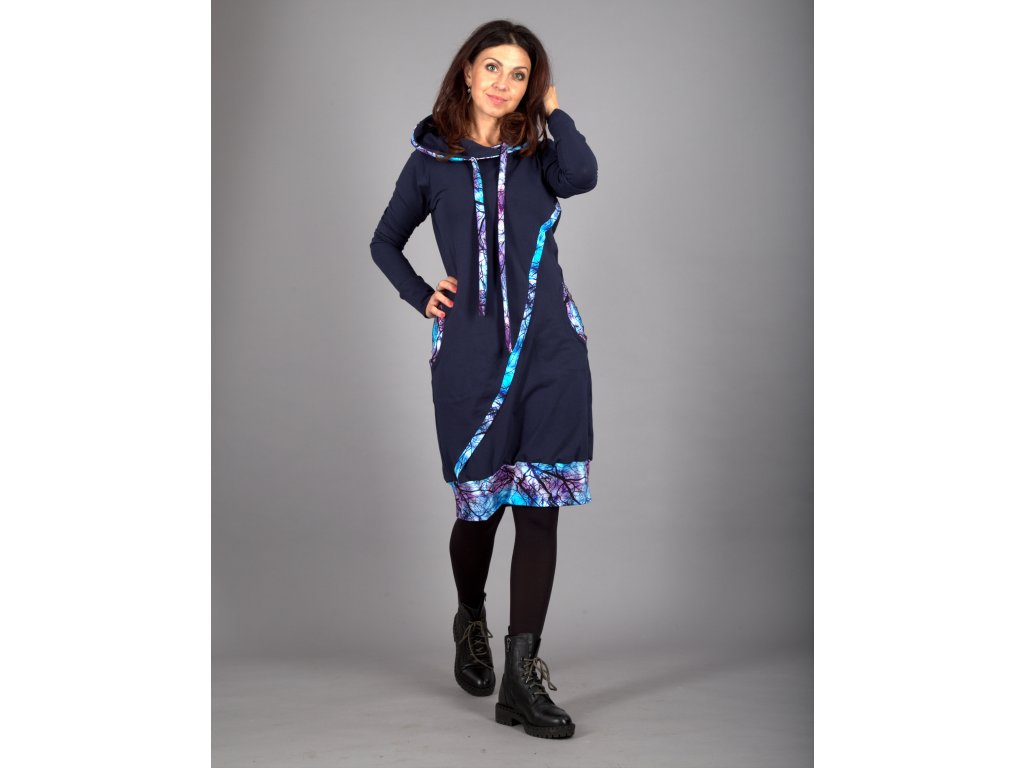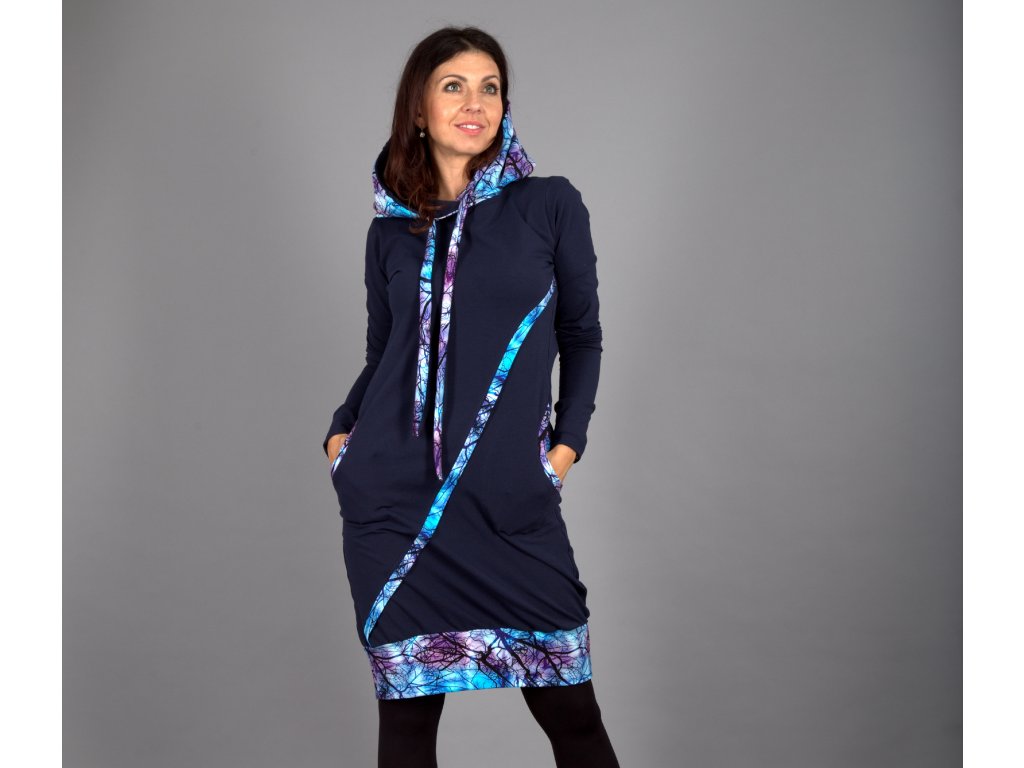 Písmenkové šaty jsou střihem příjemně anatomicky přizpůsobené. Velmi zajímavým detailem je zde široký stojáček s výstřihem do véčka, který si můžete libovolně zvednout, nebo ohrnout. Dalším velmi zajímavým detailem jsou zakončené rukávy v 3/4 délce s manžetou, která je též rafinovaně prostřižená, aby se dala upravit podle potřeby. Rozparek na dolní části šatů podtrhne celkově dojem.