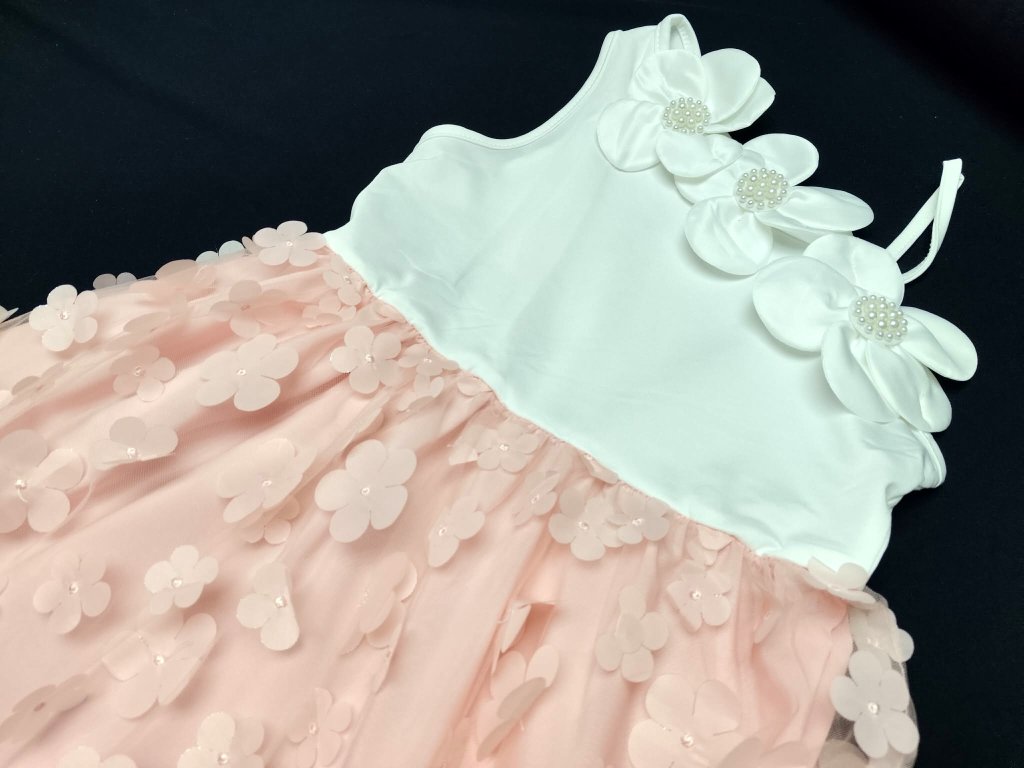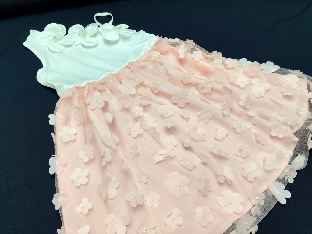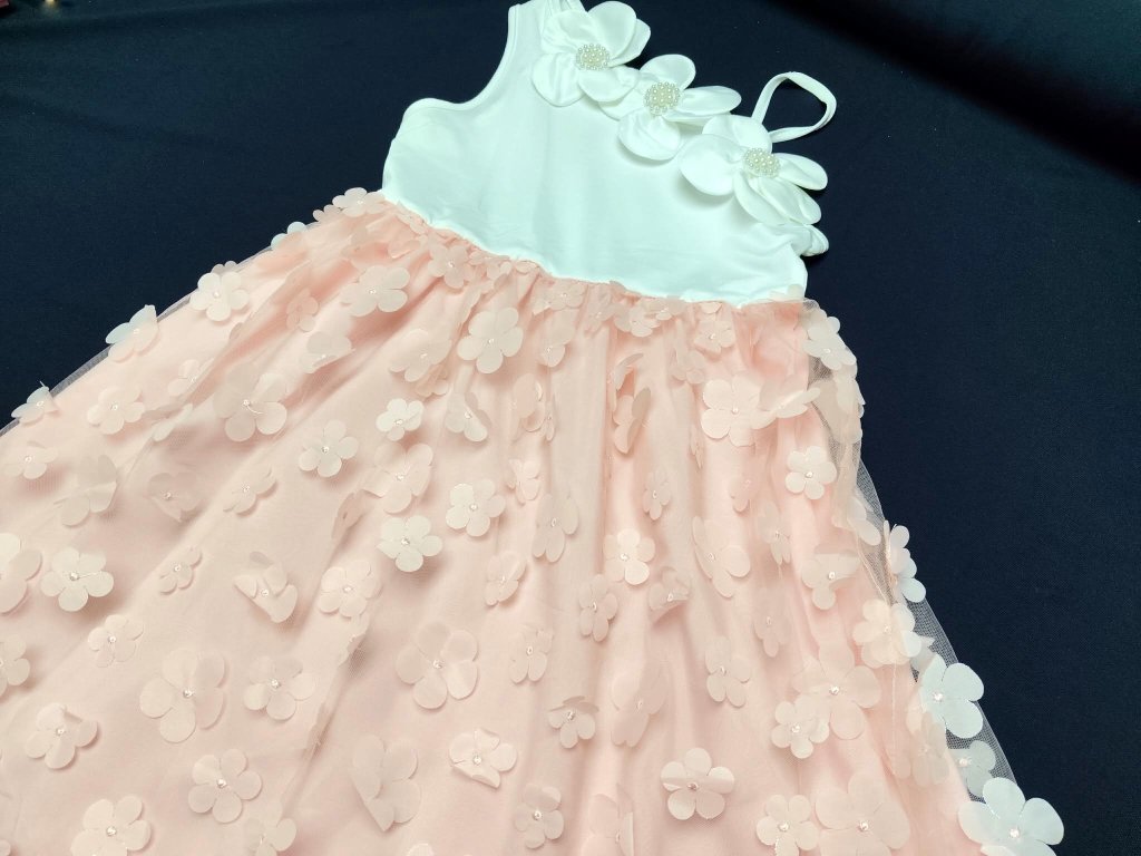 Střih do A krásně padne a zároveň nikde neomezuje. Holčička se v nich může volně pohybovat, točit se, běhat… a pořád se cítit pohodlně. Horní díl na jedno rameno dodává šatům výjimečnost. Je čistý, elegantní a zdobený výraznými květy s perličkami, které působí jako malý šperk.