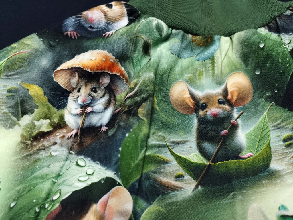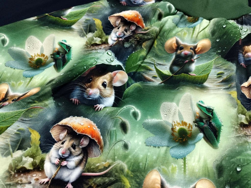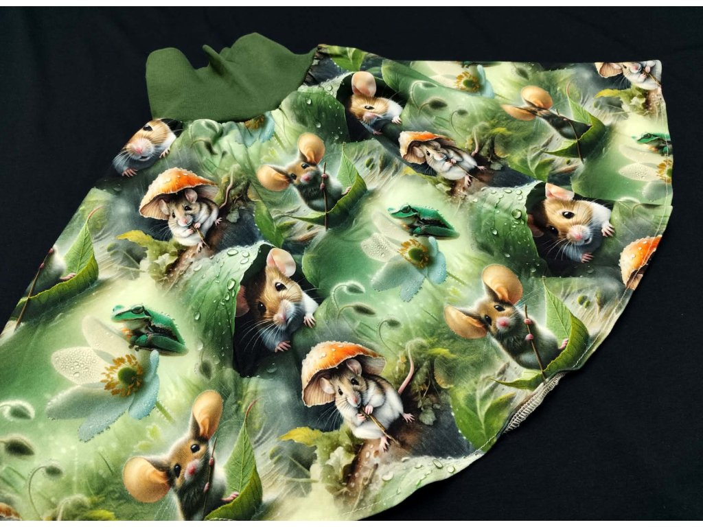 Je ušitá z velmi kvalitního bavlněného úpletu s certifikátem nezávadnosti, takže je krásně jemná, prodyšná a vhodná i pro citlivou pokožku nebo malé alergiky. A ten motiv? Myšky jsou tak živé, až máte pocit, že se každou chvíli rozběhnou do trávy. Celý tisk působí jako malý pohádkový les, který si holčička oblékne na sebe. Velké kouzlo je i v detailu, který není na první pohled vidět – pružný pas, který roste spolu s holčičkou. Díky tomu sukýnka vydrží dvě až tři sezóny a stane se oblíbeným kouskem, ke kterému se bude stále vracet. Ideální pro malé slečny přibližně od 3 do 6 let. Tohle není jen oblečení. To je kousek dětství, který se hýbe, roste a vypráví příběh.