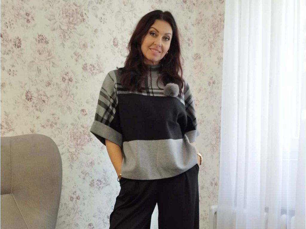 Stylový svetr z prémiové viskózy – elegance, která nikdy neomrzí. Tento krásný svetr je vyrobený z vysoce kvalitní viskózy, která je měkká, příjemná na těle a nádherně splývá. Je to ideální kousek pro vrstvení – pod svetr snadno obléknete tričko, rolák nebo lehkou košilku a vždy vytvoříte nový, promyšlený outfit. Dominantou je minimalistický geometrický vzor, který patří mezi nejoblíbenější motivy současné módy. Působí velmi elegantně, čistě a dodává svetru moderní, nadčasový charakter. Svetr má rozšířené rukávy zakončené elegantní ohrnutou manžetou, které krásně doplňují celkový střih. Stylový stojáček v černobílé kombinaci pak povznáší celý model na úroveň skutečně sofistikovaného kousku. Bambulka na svetru je připevněná jako brož a dá se jednoduše odepnout.