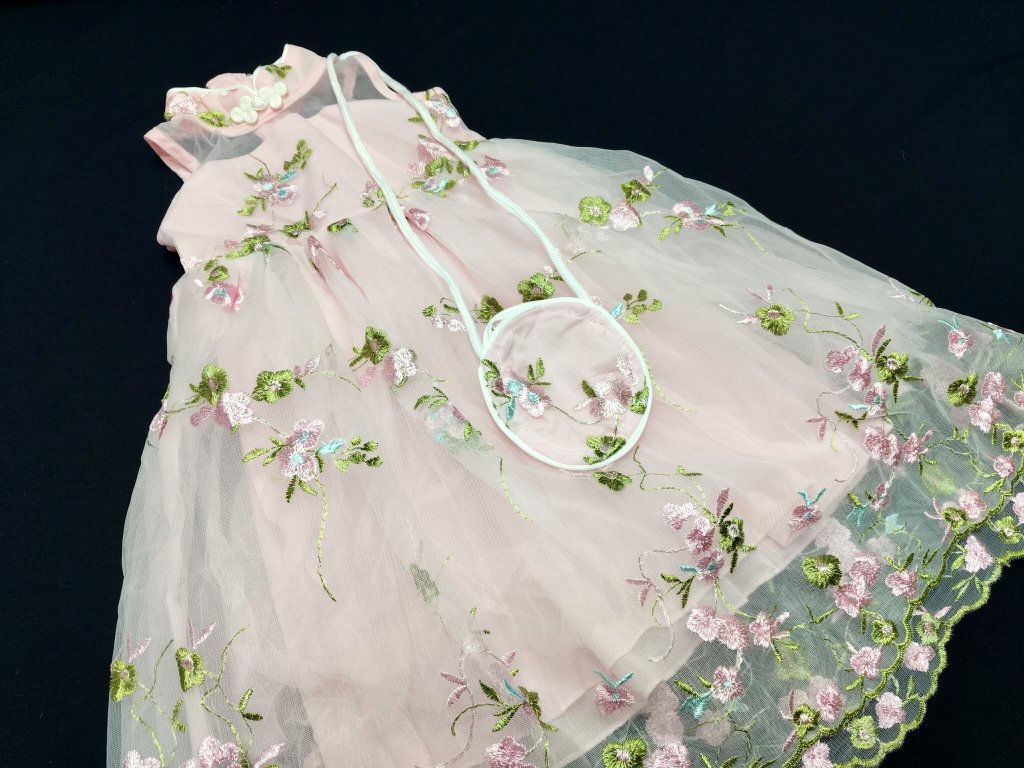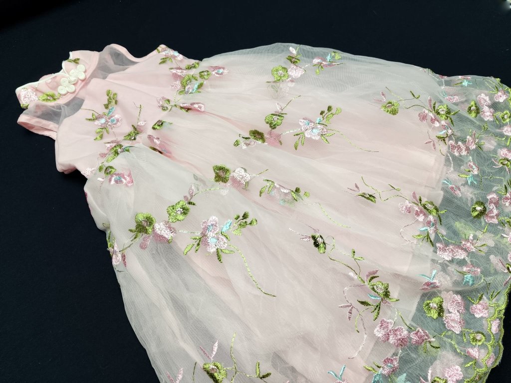 Tyhle šaty nejsou „jen hezké“. Jsou pocit. Lehký, splývavý střih se přirozeně otevírá do áčkové siluety. Nikde netlačí. Nikde neškrtí. Jen plyne s pohybem. Horní část jemně obepne tělo, ale nechá prostor dýchat. Průsvitný tyl u dekoltu vytváří něžný detail, který působí skoro jako šperk. Sukňová část se při každém kroku rozvine jako květ. Lehká, vzdušná, hravá. A ty výšivky… Nejsou tam jen pro krásu. Dělají z každého pohybu malý okamžik pozornosti.